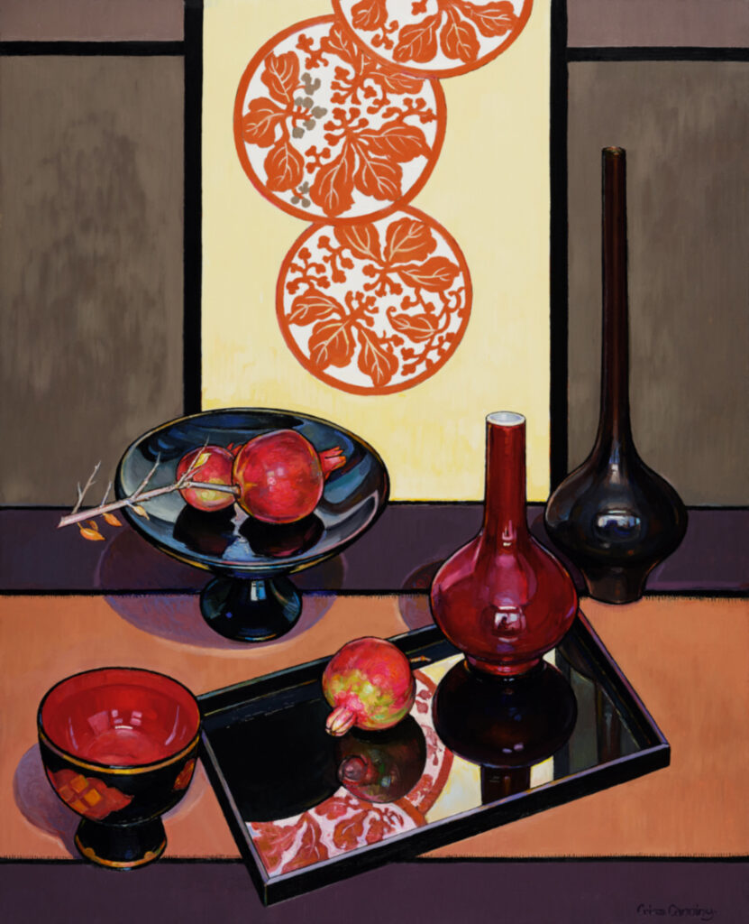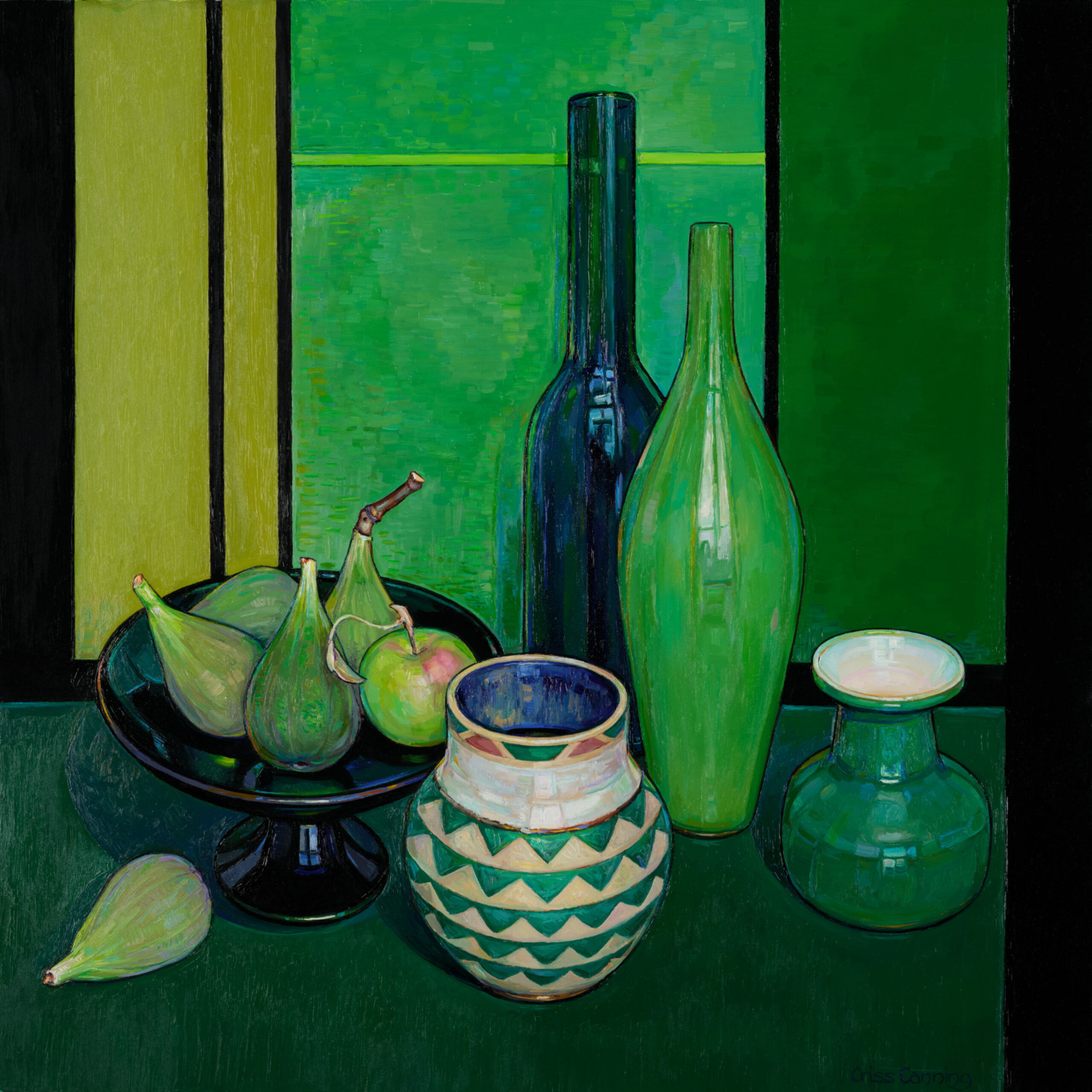Photographs do not come anywhere near revealing just how brilliant these paintings are. In days when giant teddy bears and bananas stuck on walls are considered “art” it will do your soul good to see these paintings in the flesh. They repay close scrutiny. The longer you look at them the more is revealed. The work is technically brilliant. The drawing, the composition and the colour harmonies are the result of the sixty years of hard work Criss Canning has spent honing her skill. But there is also something indefinable in these paintings. Heart or spirituality may be the words which could be used to describe the magic in this work.