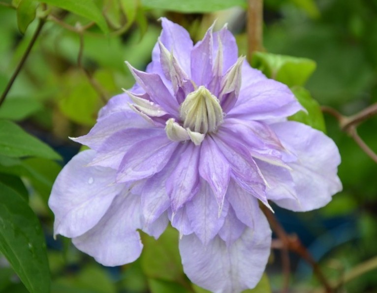 During spring the large light mauve-blue flowers are fully double made up with layer on layer of tepals. After this first flowering is over a light trim is in order and then later in the season more flowers will be produced but this time single. As the double flowers are quite heavy the vine should be tied into strong supports. Height 1.50-2 mete width 1-1.5 metres.