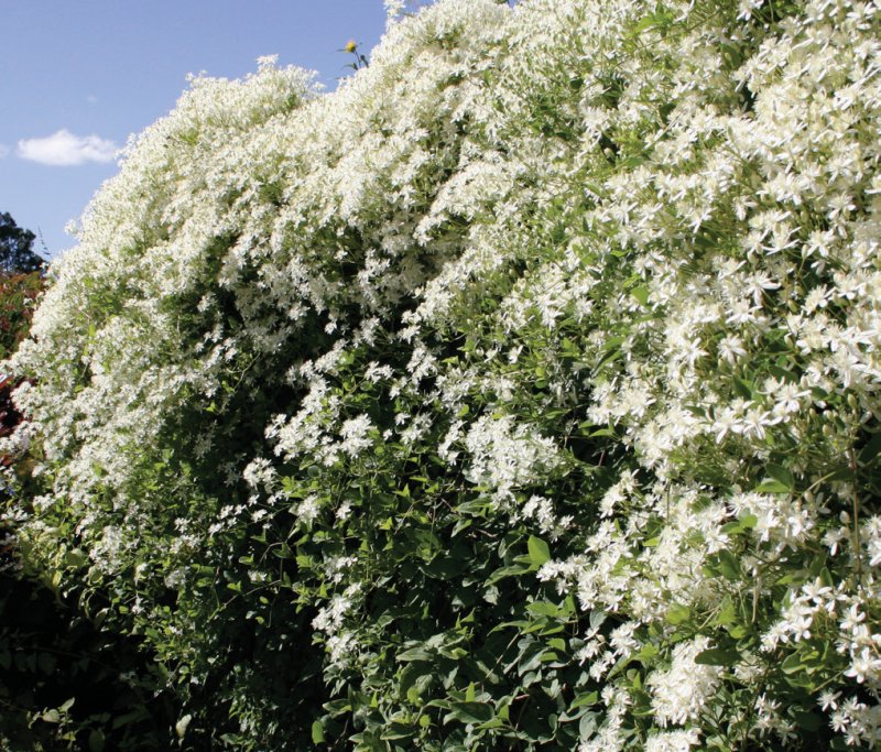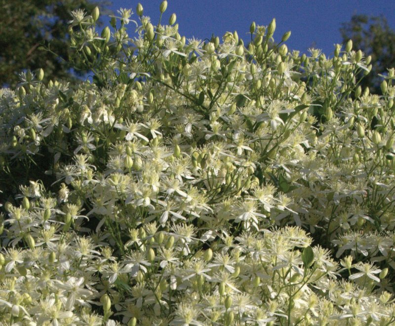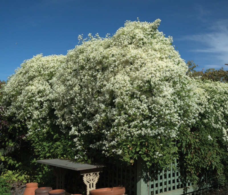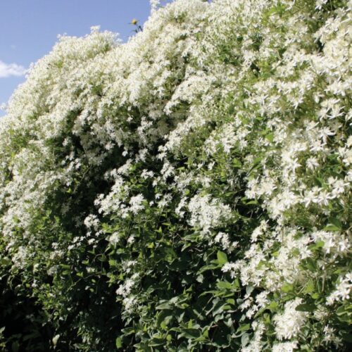 The toughest and easiest of all Clematis to grow, this is named “sweet” because of its wonderful honey fragrance. We grow it on a trellis in our double borders where, although cut back to 60cm during winter, it covers an area about 2 metres in height and 4-5 metres in width. During early autumn it is completely smothered by sweetly scented white flowers. In one part of the garden this has grown and flowered with no watering at all and it must be the most drought tolerant of all the Clematis.