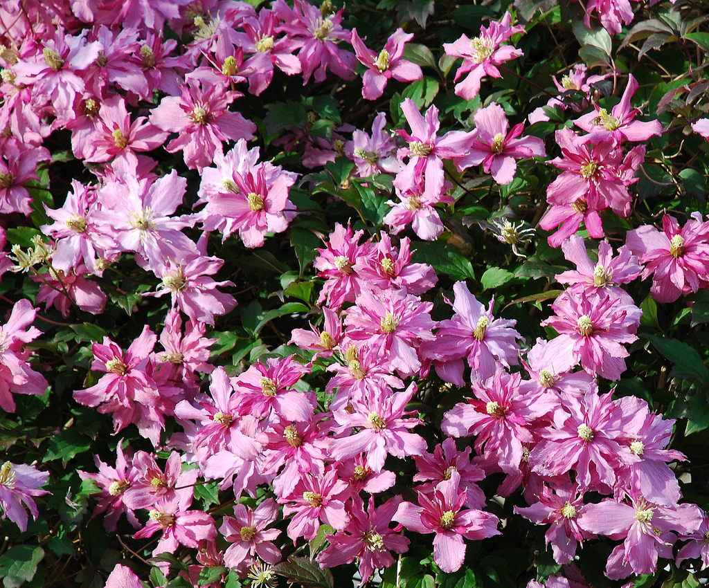 ‘Broughton Star’, an RHS Award of garden merit plant, makes a mass display of double soft amethyst pink flowers during spring. Being a form of the very vigorous C. montana it will soon cover a trellis, fence or wall. As it flowers on the old season’s wood on the rare occasions it may need pruning it is best done after flowering. 400cm by 400cm.