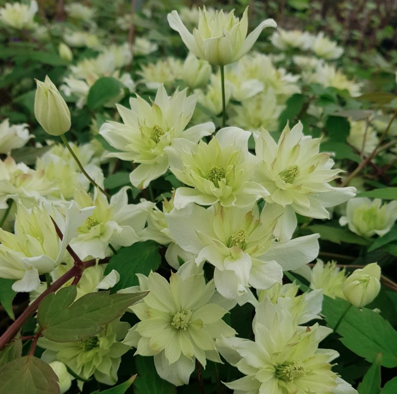 This new addition to the montana group of clematis has high-quality double cream flowers with lime green centres. Relatively moderate in growth, it can still reach 6 metres but with judicious pruning after its spring flowering, can be kept to a more modest size. The montana group will soon cover unsightly buildings and neighbours.