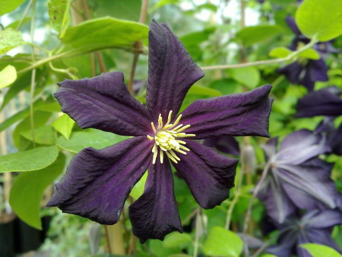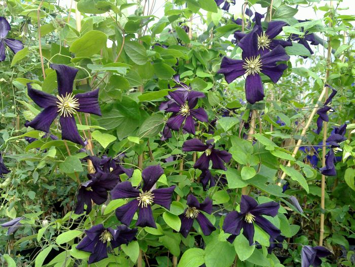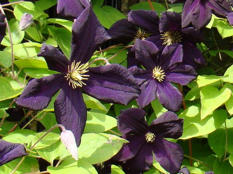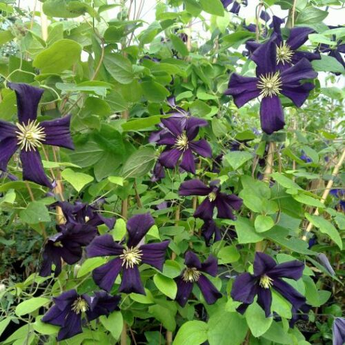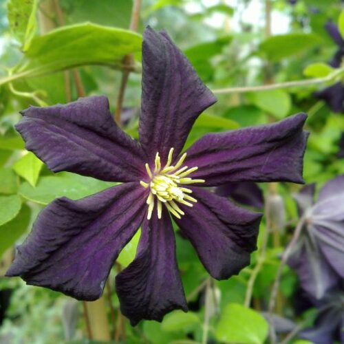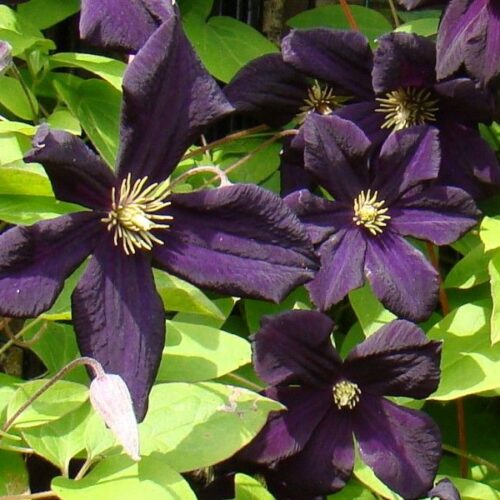 This captivating Clematis has very dark purple flowers which are almost black when they first open. As the flowers age they turn reddish purple. The 7-12cm flowers are freely produced on a 240-300cm vine.  As ‘Romantika’ flowers on the current year’s growth, cut down to 15-30cm during winter. ‘Romantika’ makes a great plant to cover a fence, an arbour or trellis or clamber through trees and climbing roses.