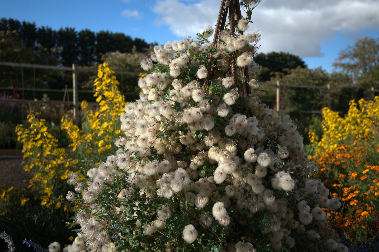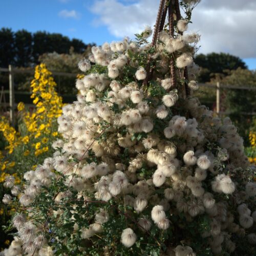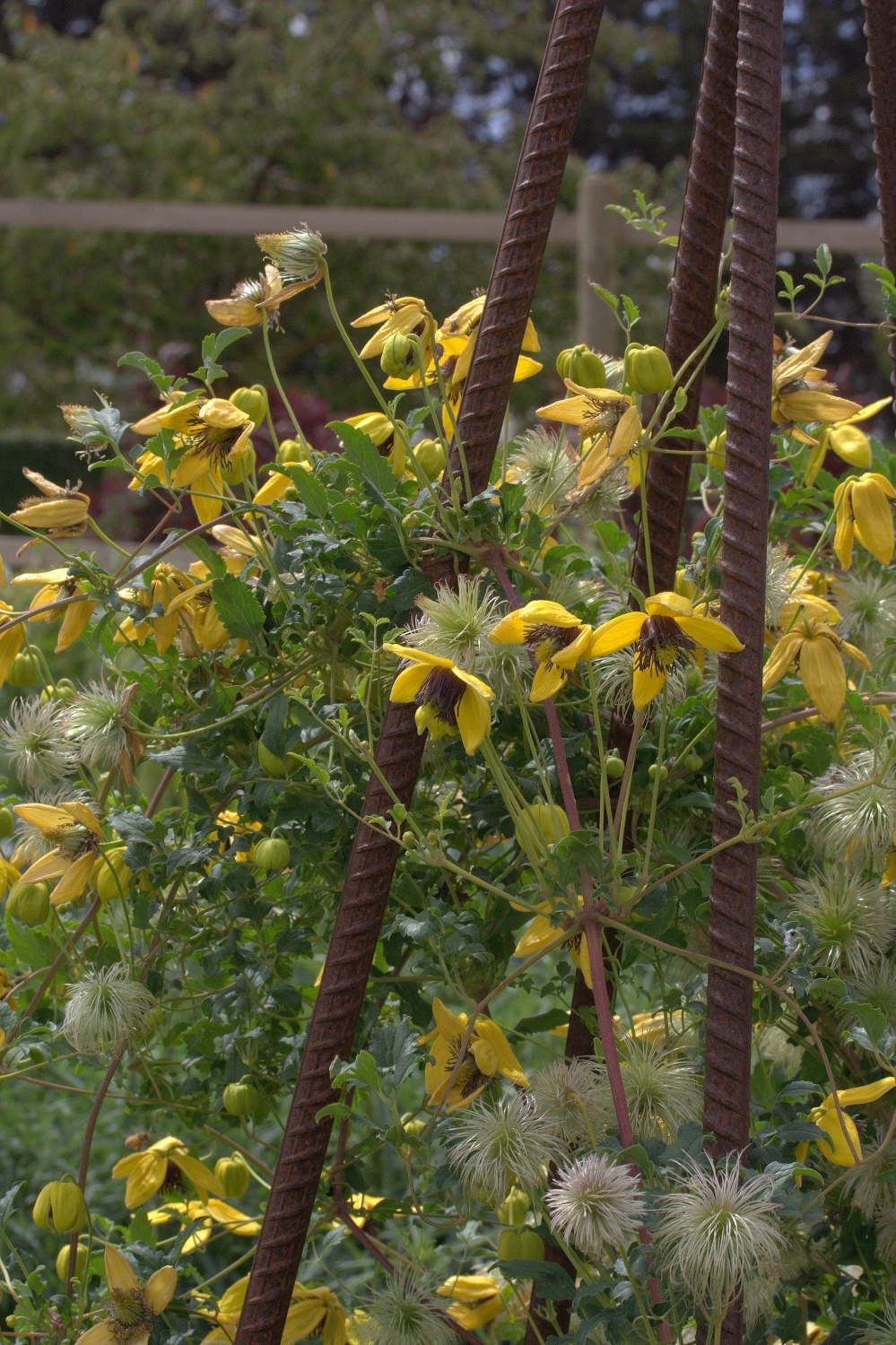 Easy to grow and free flowering, we’ve had ‘Golden Tiara’ growing on a fence for many years now and it never ceases to astonish us with its long-flowering beauty. It is also a major element in the double borders along the main axis in our flower garden where it produces its rich lemon waxy flowers from early summer until autumn. Each flower gives way to a showy silver haired seed head. By winter the whole plant looks as though it’s covered by a grey fluffy beard which earns it the name ‘Old Man’s Beard’. It’s best cut to ground level every winter. 200cm x 150cm.