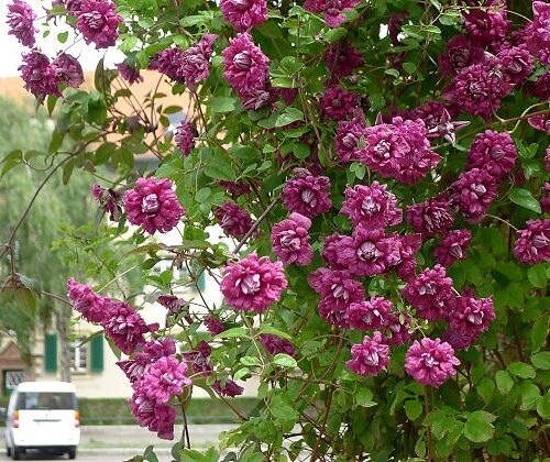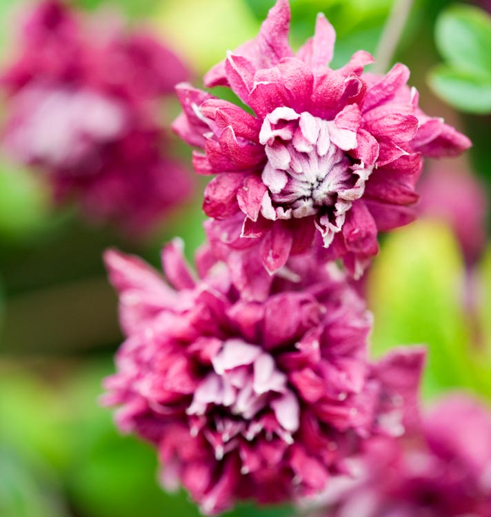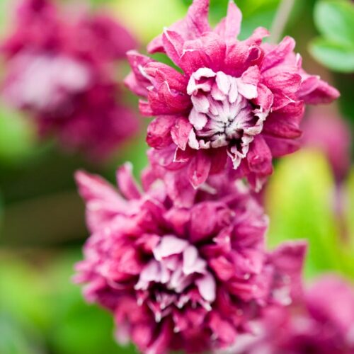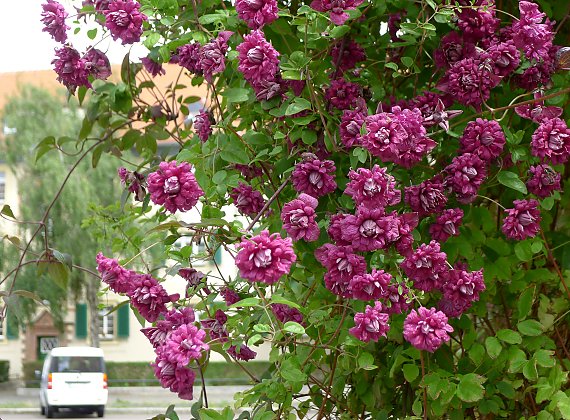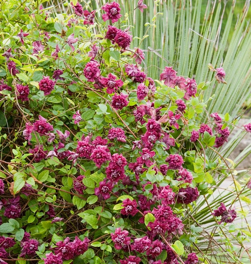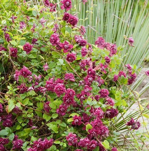During late spring and early summer and again in late summer and autumn Clematis ‘Purpurea Plena Elegans’ is smothered with masses of small, dusky rose-plum, fully double flowers 5cm in width with a paler centre. First flowering from November until early January it will rebloom late during February, March and April if cut back hard after the first flush of bloom is spent. Cut back again to 20-30cm during winter. An RHS Award of Garden Merit plant.