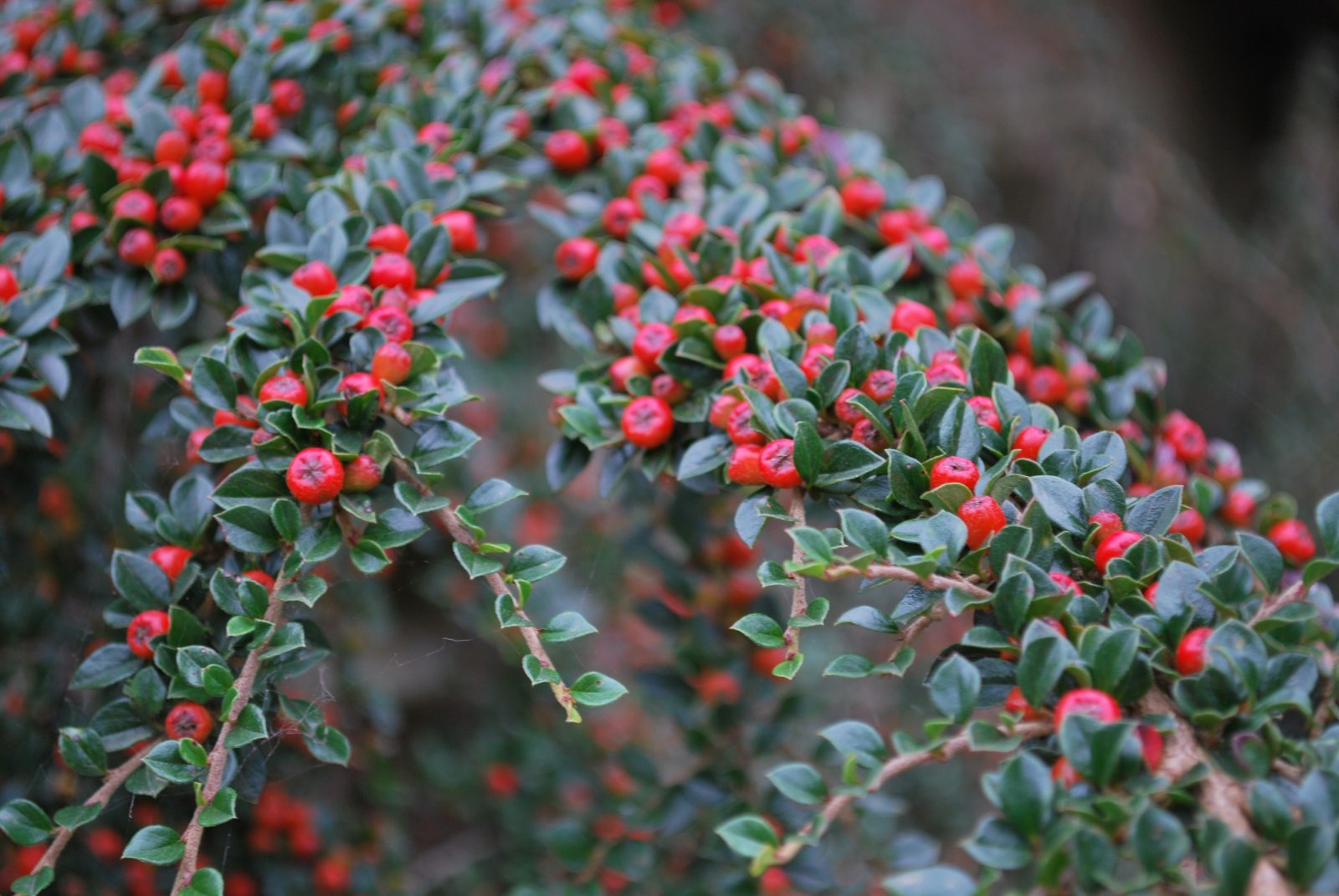 This native of mountainous areas of Nepal, China and Taiwan is both tough and handsome, in a stiff, angular sort of way. The small glossy leaves are a foil for the masses of bright red berries which are produced in autumn and are still showy in winter. Growing 90cm tall by a bit more across it is drought tolerant when established. It is especially handsome when trained against a wall. Happy in sun or light shade. RHS Award of Garden Merit.