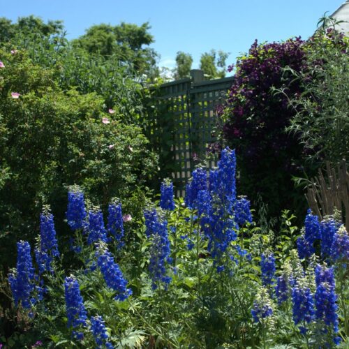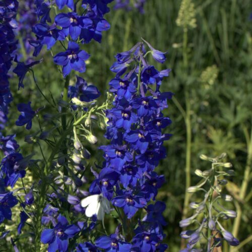 More Delphinium ‘Volkerfrieden’ plants are grown world-wide than any other Delphinium as it makes such a wonderful commercial cut flower as well as a superb garden subject. Soundly perennial, self-supporting and branching, ‘Volkerfrieden’ is in flower with us for 20 weeks of the gardening year starting during November and still going into April. Cut spent flowering stems to the ground to encourage new growth and more columns of dark sky-blue flowers. Needing good soil and some summer irrigation, this sun lover will repay every effort. 120cm x 75cm.