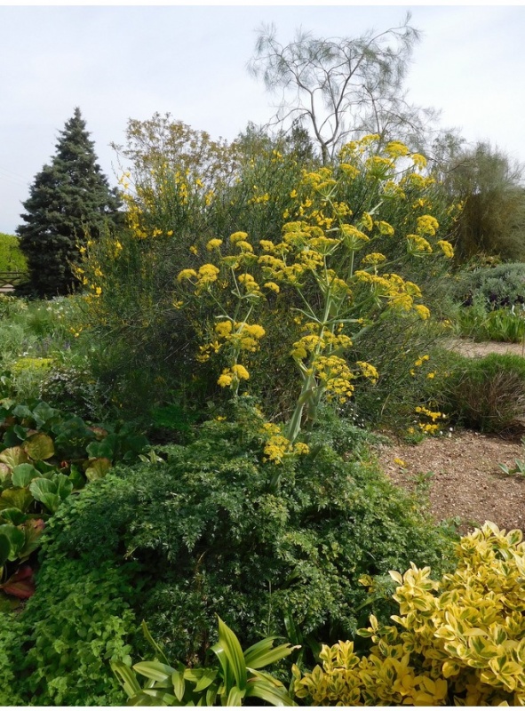 A striking plant both in foliage and flower Ferula tingitana makes 1.5 metres wide mounds of much dissected yew green foliage. After a couple of years it produces a thick two metre spear which opens to huge rounded acid yellow flower heads. It is happy in any sunny spot and is drought tolerant when once established. Summer dormant. A clone of this plant is thought to have been the source of Silphium a very precious and expensive aphrodisiac, acting rather like Viagra, perfume and medicine in classical Roman times.