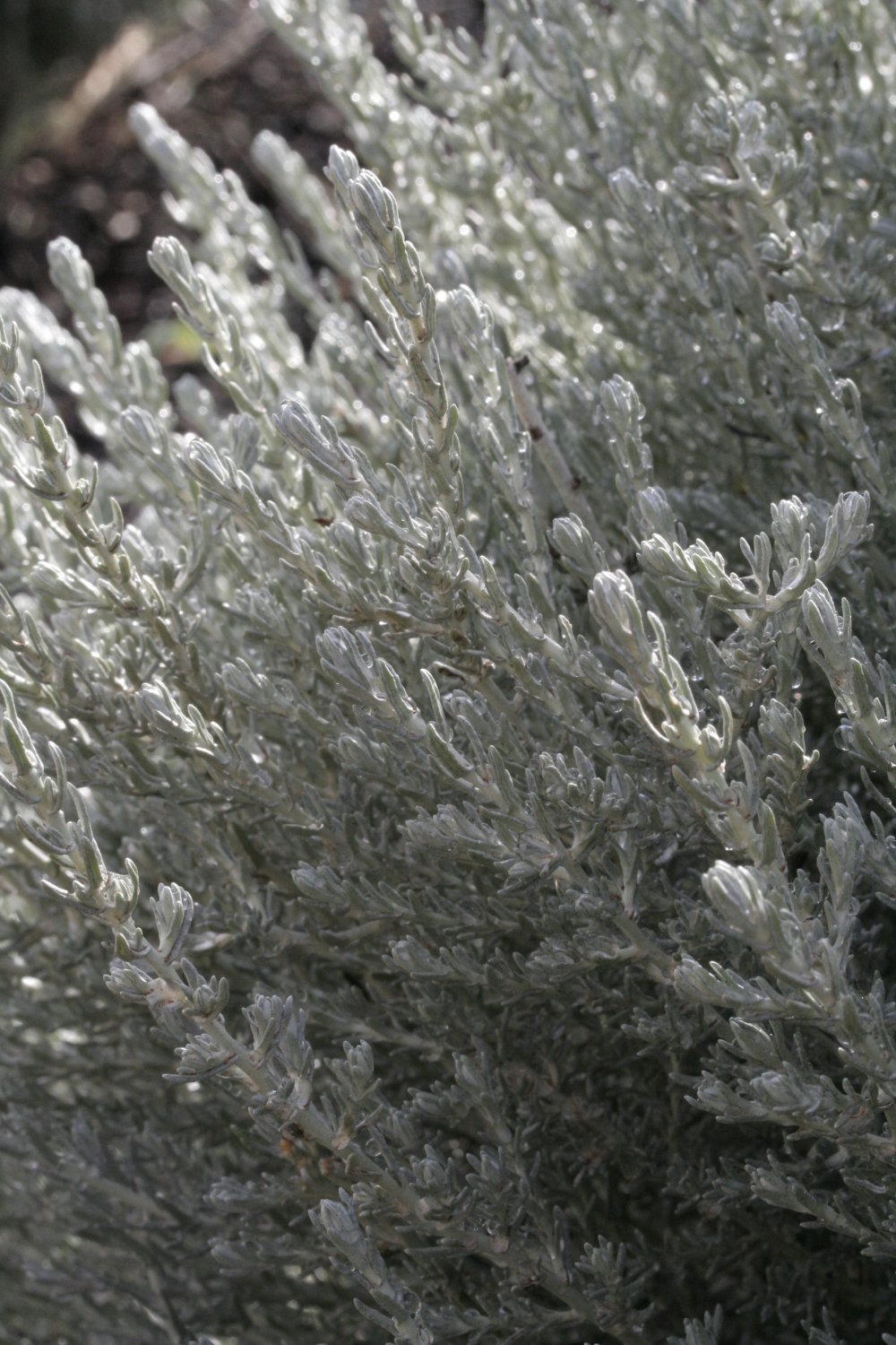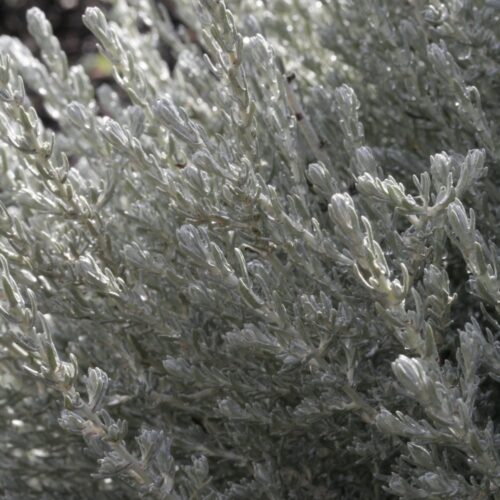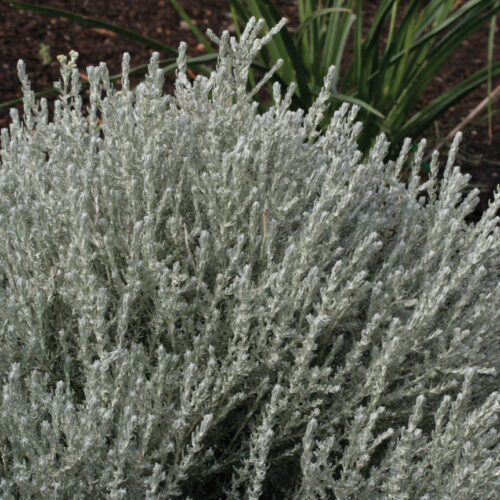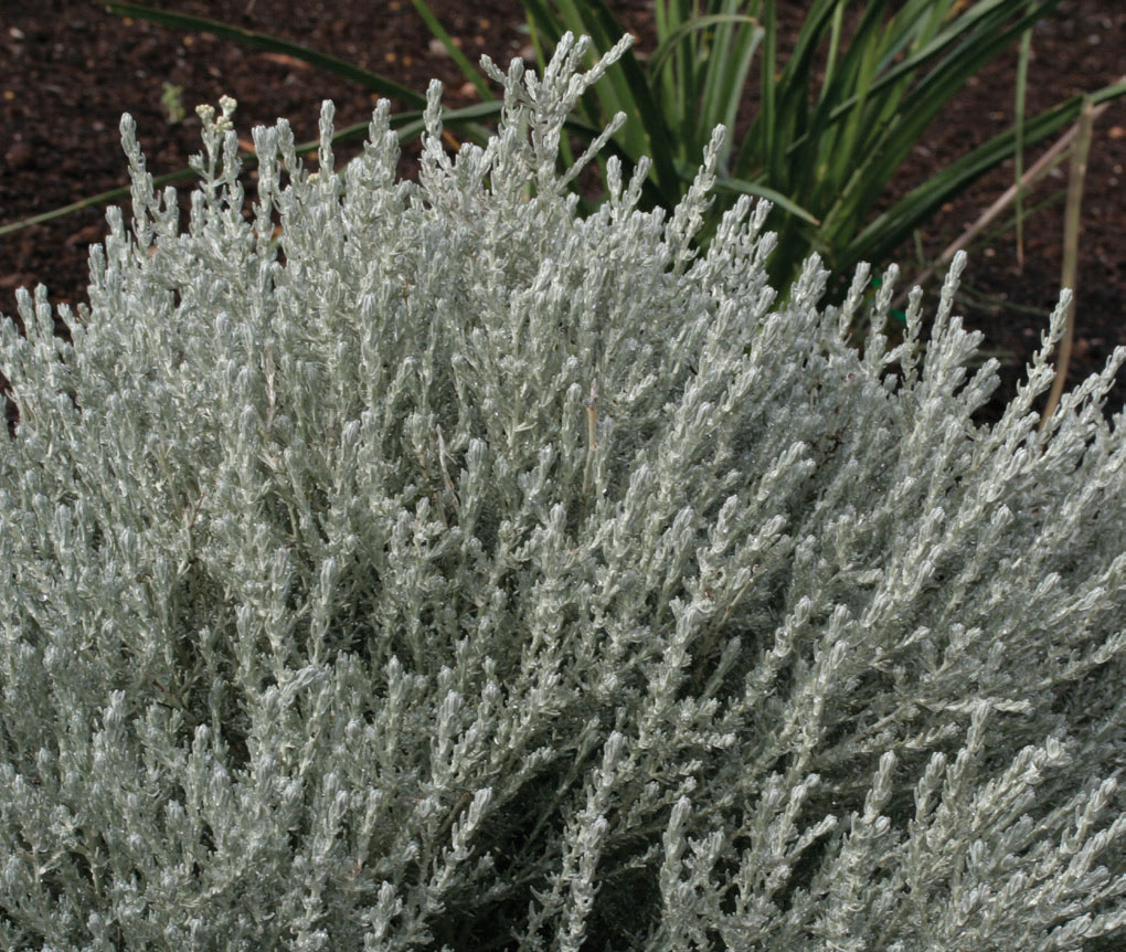 As silver as silver can be is this form of the curry plant. Tiny, intensely-silver leaves clasp tightly to arching silver stems. This neat plant grows about 40cm tall by 60cm across. A delicious fragrance of curry is given off by the leaves as you brush past this plant. Late spring and summer heads of yellow wattle-like flowers are a bonus in this drought tolerant and sun loving evergreen shrub.