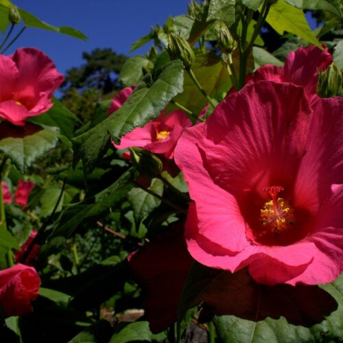 Hibiscus paramutabilis is a superb frost hardy hibiscus only very recently brought into cultivation in western gardens from its Chinese homeland. It will grow into a 180cm tall and 140cm wide shrub and produces large, rich dark rose-pink flowers from mid-summer until quite late into autumn. One of the best summer flowering shrubs it is fairly drought tolerant although better for some summer irrigation and is happy in a reasonably fertile sunny spot.