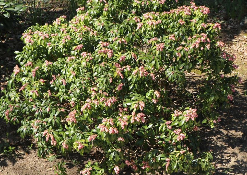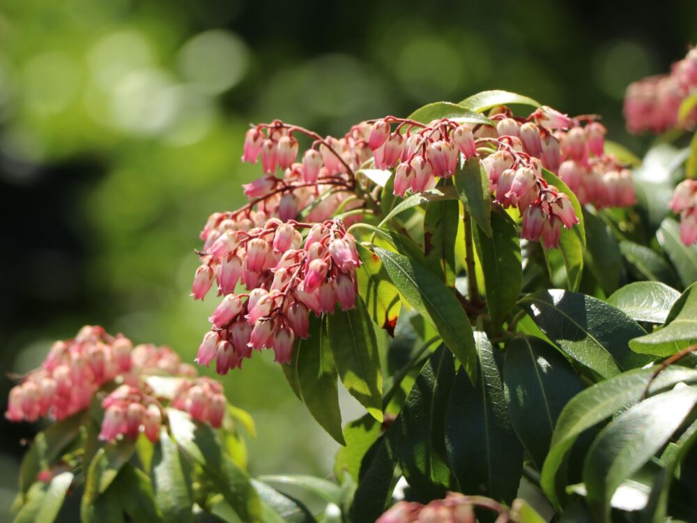 Pieris japonica, in its native Japanese and Chinese habitat, grows up 2.5 metres tall. ‘Shojo’ is a smaller growing selection making a compact, mounded evergreen shrub. Its new spring foliage is soft red maturing to glossy dark green. Clusters of deep pink lily-of-the-valley flowers emerge from dark red almost black buds in early spring. Best grown in moist, well drained soil in light to medium shade. It prefers slightly acid soils and will not grow well in alkaline areas. Height 120-150cm with a spread of 100-150cm.