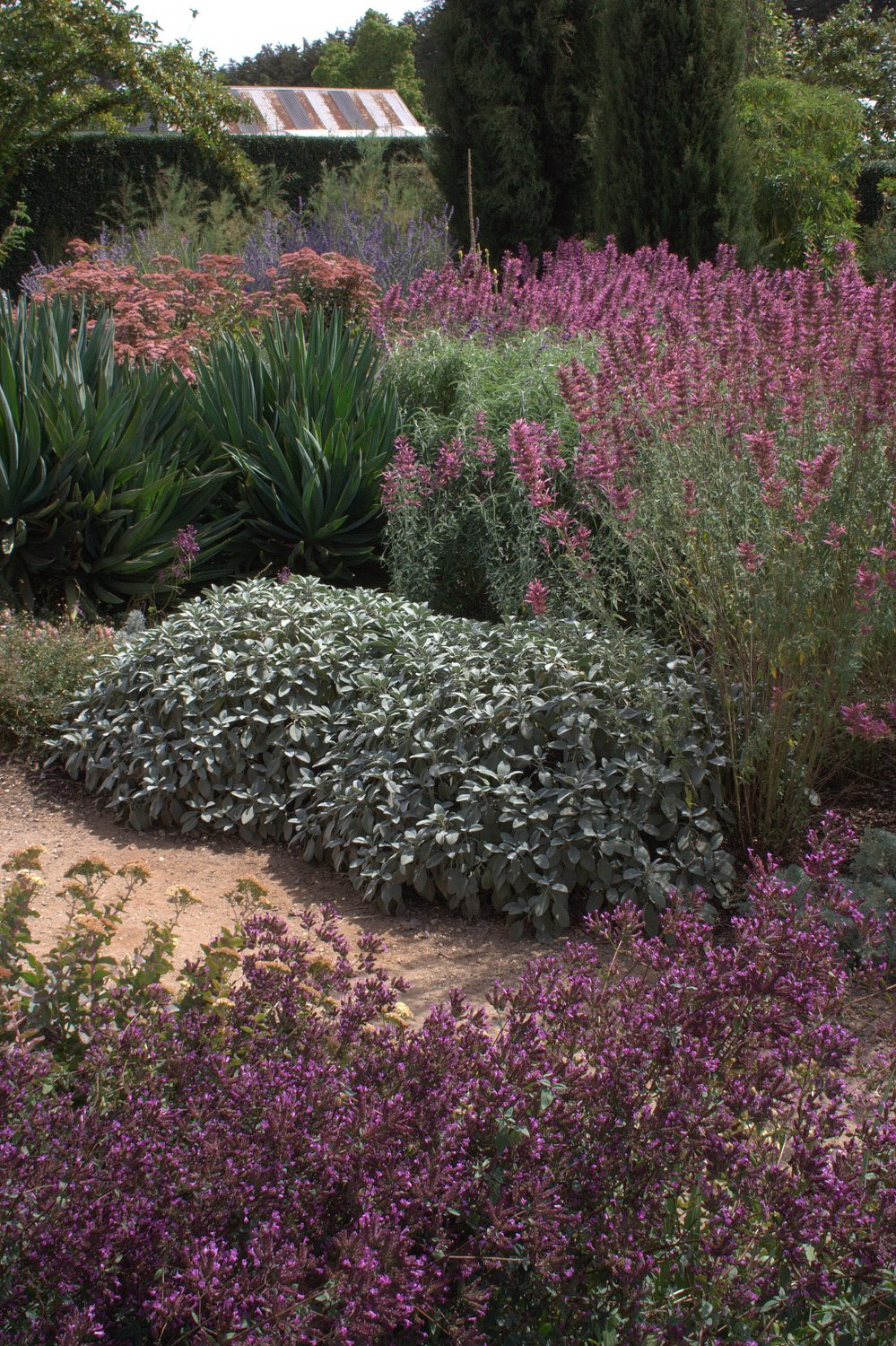 Salvia ‘Berggarten’, which rarely flowers, is one of the finest of all silver-grey foliage plants rarely, if ever, having a down season. It makes an evergreen shrub some 60cm tall by a little more wide. Best grown in a sunny well drained spot it is drought tolerant when once established. ‘Berggarten’ is the recipient of the prestigious Award of Garden Merit of the Royal Horticultural Society. This award is only given to the very best garden plants. As ‘Berggarten’ is a selection of the culinary sage it has a dual purpose role in the garden. One can admire its beauty and also cook with it.