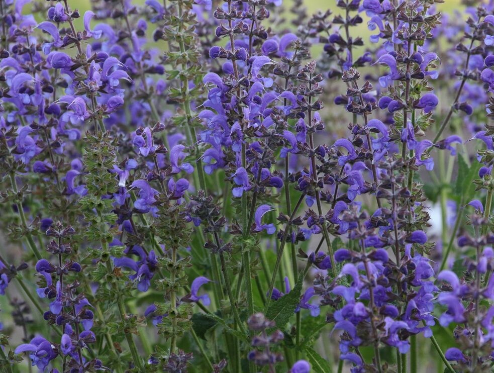 Loved by pollinators, cut flower growers and gardeners alike, this meadow sage has dense flower heads of soft mauve blue blooms. This handsome meadow sage makes flat rosettes of crinkled leaves from which metre tall stems carrying the flowers are produced. These taller clones are a so useful in the garden especially as the nursery trade is obsessed with producing super dwarf varieties which look OK flowering in a pot but are unimpressive in the garden. Meadow Sage are happy in any sunny well drained spot which gets a little extra water during very dry spells, and it will rebloom after dead-heading throughout summer and into autumn. 100cm by 70cm.