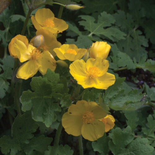 A plant of the Eastern US woodlands his plant is best grown in a moist shaded spot. Yellow poppies, the size of a 50-cent coin, are held on 30cm tall stems from early spring until early summer. The large oak-like basal leaves, green above greyish beneath, are handsome in themselves. 30cm x 30cm.