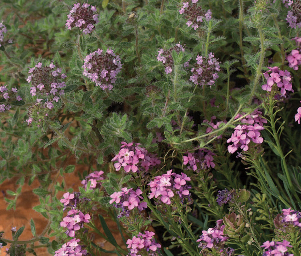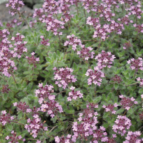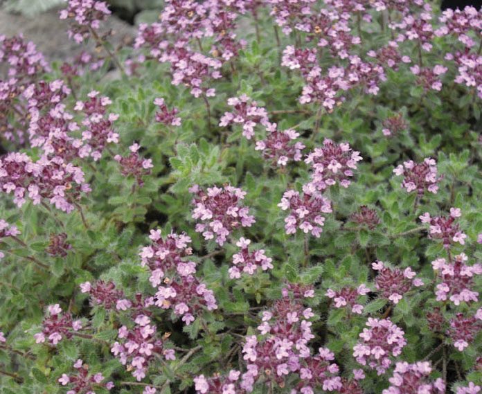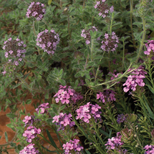 We imported Thymus ciliatus from Olivier Filippi’s wonderful nursery in the south of France. It has done well here at Lambley growing in hot sunny spots. It makes low ground covering mat of greyish hairy leaves, 5cm tall by 50cm or more across. These mats are covered in spring by heads of soft pink flowers set in purple calyces. The foliage will often turn red during winter. Thymus ciliata does much better in our harsh summers than most other decorative thymes whish are mostly English selections. Best grown in full sun.