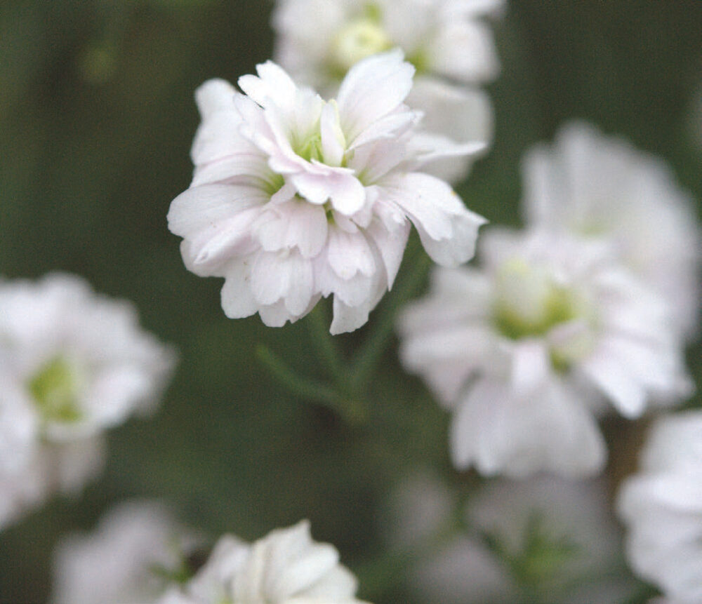 The double white rock jasmine makes a charming, tidy, mat forming perennial clothed with short needle-like leaves. During late spring, summer and beyond the it produces 15cm lax stems which are covered in small, double, white Gypsophila-like flowers. A good plant for a sunny rock garden, the tunic flower is drought tolerant when once established. 10cm x 30cm.