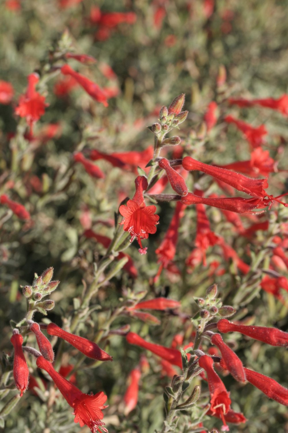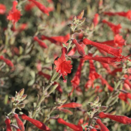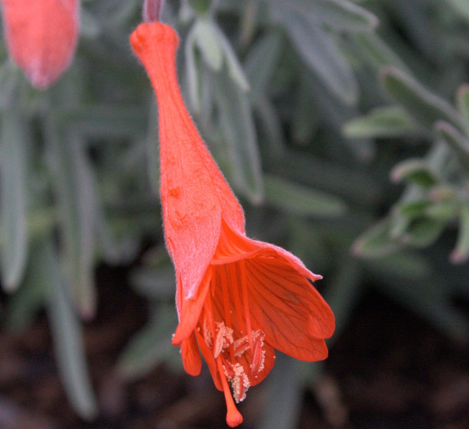 During spring the Ruby Throated Hummingbird migrates from its Mexican winter headquarters through California and other US western states to Canada to breed. During this spring migration there are lots of flowers to sustain them. On the way back less so. The late flowering Zauschnerias are amongst the most important food sources on the Hummingbird’s trip back to their winter homes. Z. ‘Catalina’ was collected on Catalina Island off the coast of Southern California. It is the last of the species to flower flowering late to coincide with the arrival of the Hummingbirds from their Canadian sojourn. In the Zauschneria trials at the Rancho Santa Ana Botanic Gardens (the leading botanic garden specialising in Californian plants) it was one of the best of 30 cultivars grown. Spectacular orange-red trumpets are complimented by its silver leaves. It makes a sub-shrub some 30cm tall by 80cm across.